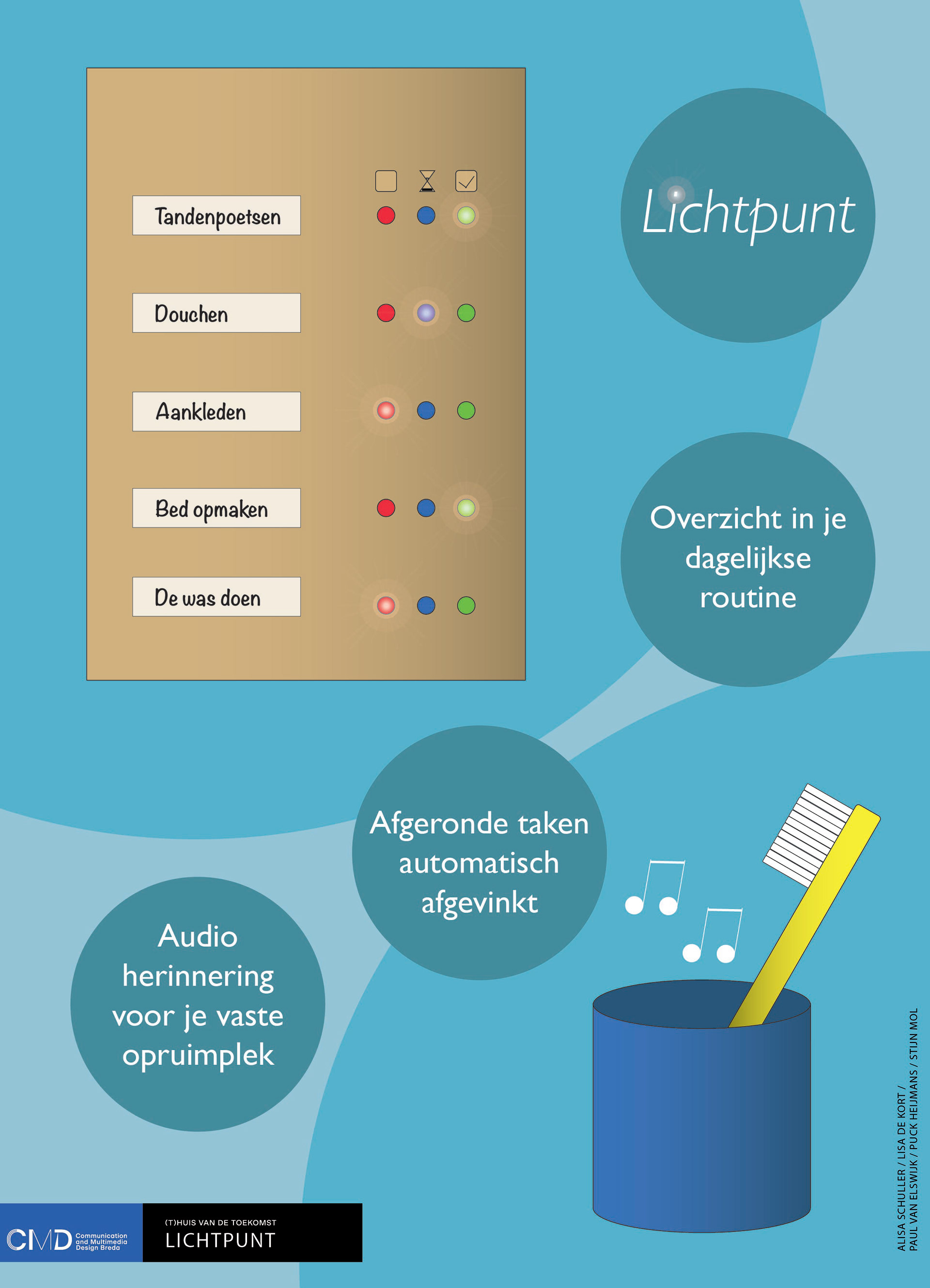 For (T)huis van de Toekomst I made a project called Lichtpunt with fellow students. For the Lichtpunt project, I designed a poster that communicates our concept clearly and attractively. The concept featured a smart to-do list that automatically checks off tasks, which can be especially helpful for people with dementia or others who struggle to maintain an overview. With the poster, I clearly visualized the core of the idea, making Lichtpunt's function and added value clear at a glance.